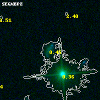 Object #8963 x,y = (930, 3834) RA, Dec = (04:54:21.768, 02:55:42.24) = (73.59070, 2.92840) BPZ = 0.454 [0.041--2.368] type = 8.80 (SB2_B10 - SB1_B10) chisq2 = 0.00 ODDS = 0.43 z_cluster = 0.203