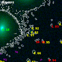 Object #9081 x,y = (5949, 3805) RA, Dec = (04:54:01.680, 02:55:40.44) = (73.50700, 2.92790) BPZ = 0.918 [0.853--1.344] type = 9.50 (SB3_B10 - SB2_B10) chisq2 = 0.41 ODDS = 0.68 z_cluster = 0.203