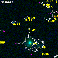 Object #917 x,y = (4702, 800) RA, Dec = (04:54:06.672, 02:52:40.08) = (73.52780, 2.87780) BPZ = 0.449 [0.170--4.025] type = 7.30 (Scd_B10 - SB1_B10) chisq2 = 0.17 ODDS = 0.06 z_cluster = 0.203