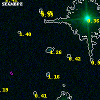 Object #9399 x,y = (3073, 3616) RA, Dec = (04:54:13.200, 02:55:28.92) = (73.55500, 2.92470) BPZ = 1.259 [0.654--1.904] type = 7.80 (SB1_B10 - Scd_B10) chisq2 = 0.00 ODDS = 0.19 z_cluster = 0.203