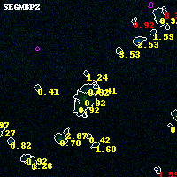 Object #9421 x,y = (6370, 3606) RA, Dec = (04:53:59.976, 02:55:28.56) = (73.49990, 2.92460) BPZ = 0.916 [0.776--1.606] type = 8.90 (SB2_B10 - SB1_B10) chisq2 = 0.03 ODDS = 0.38 z_cluster = 0.203