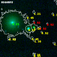 Object #9665 x,y = (5700, 3516) RA, Dec = (04:54:02.664, 02:55:23.16) = (73.51110, 2.92310) BPZ = 0.124 [0.080--0.262] type = 5.10 (ES0_B10 - Sbc_B10) chisq2 = 0.00 ODDS = 0.85 z_cluster = 0.203