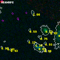Object #9746 x,y = (1716, 3528) RA, Dec = (04:54:18.624, 02:55:23.88) = (73.57760, 2.92330) BPZ = 0.593 [0.152--3.185] type = 8.70 (SB2_B10 - SB1_B10) chisq2 = 0.04 ODDS = 0.08 z_cluster = 0.203