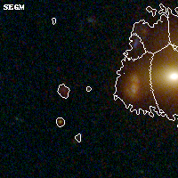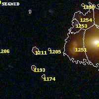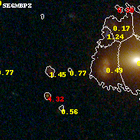 Object #1205 x,y = (2231, 4834) RA, Dec = (04:54:16.560, 02:56:42.00) = (73.56900, 2.94500) BPZ = 0.770 [0.105--4.438] type = 8.30 (SB1_B10 - SB2_B10) chisq2 = 0.34 ODDS = 0.13 z_cluster = 0.203