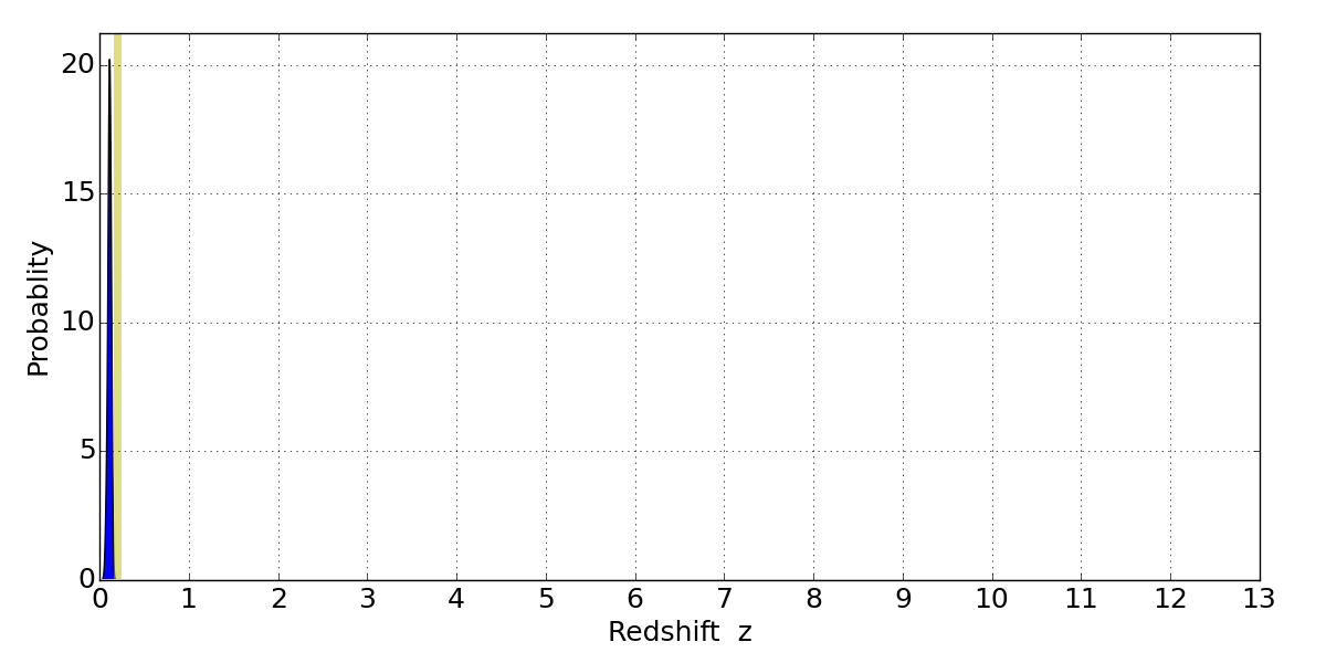 In P(z) plots: Yellow lines mark the cluster redshift z = 0.203,