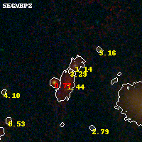 Object #464 x,y = (3985, 2020) RA, Dec = (04:54:09.528, 02:53:53.16) = (73.53970, 2.89810) BPZ = 3.291 [0.142--3.578] type = 6.80 (Scd_B10 - Sbc_B10) chisq2 = 0.51 ODDS = 0.37 z_cluster = 0.203