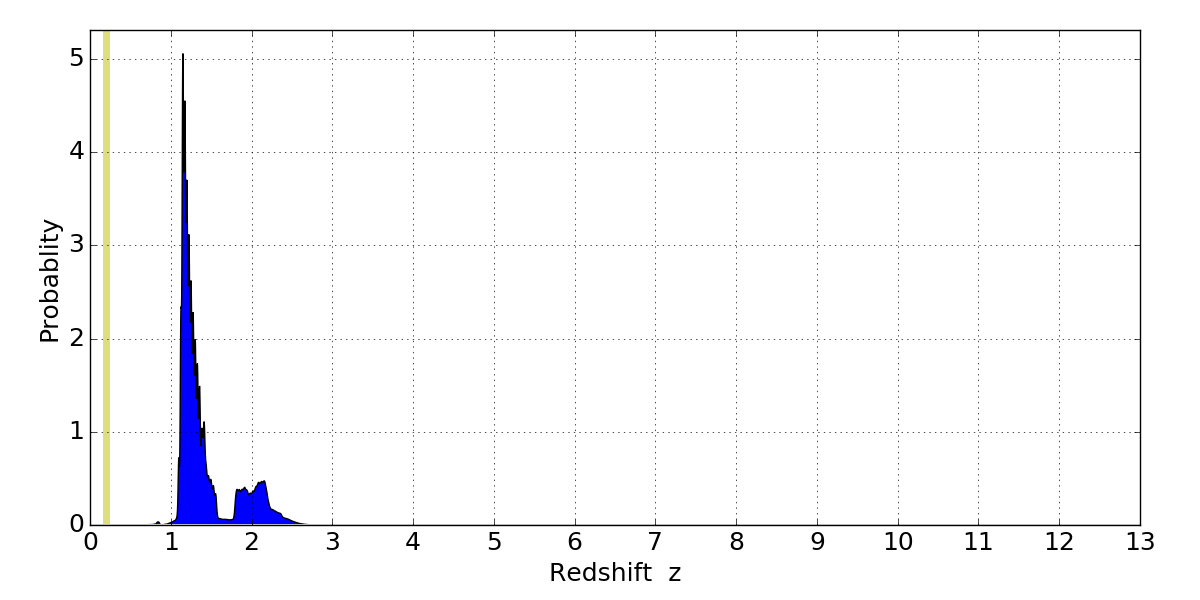 In P(z) plots: Yellow lines mark the cluster redshift z = 0.203,