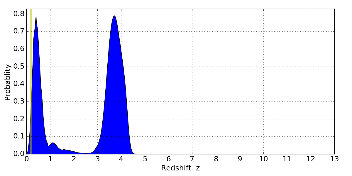 In P(z) plots: Yellow lines mark the cluster redshift z = 0.203,