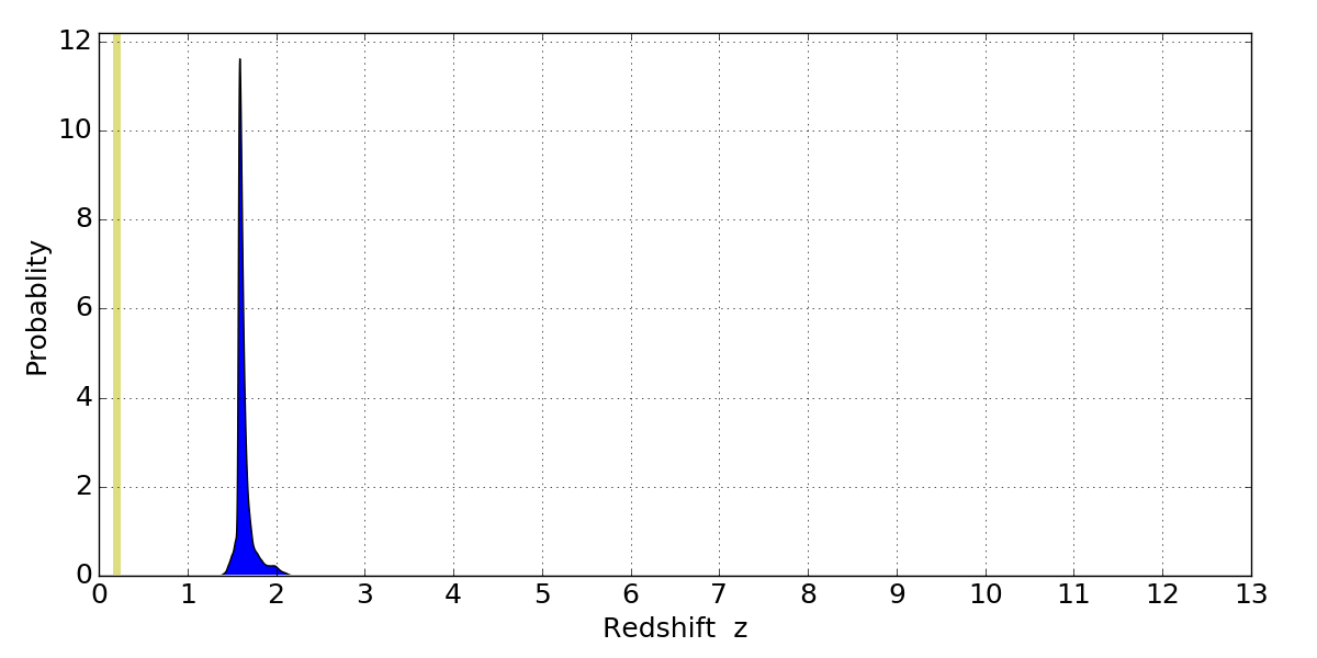 In P(z) plots: Yellow lines mark the cluster redshift z = 0.203,