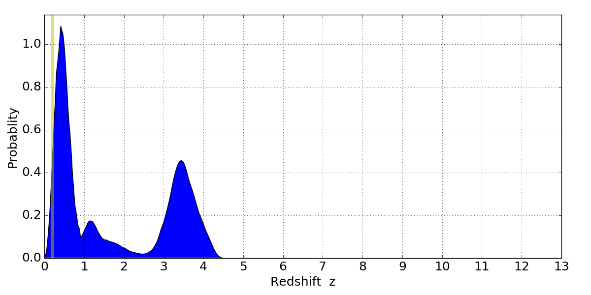 In P(z) plots: Yellow lines mark the cluster redshift z = 0.203,