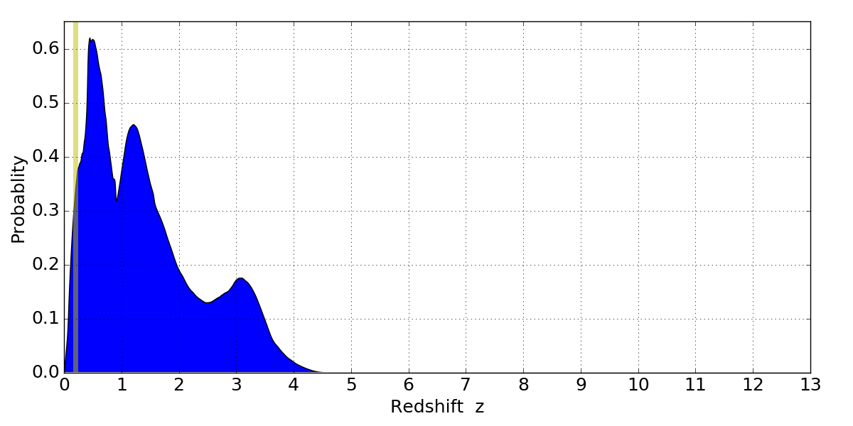 In P(z) plots: Yellow lines mark the cluster redshift z = 0.203,