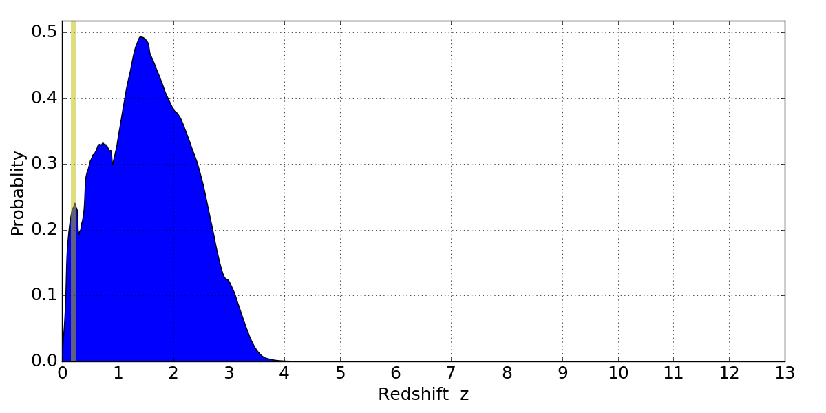 In P(z) plots: Yellow lines mark the cluster redshift z = 0.203,