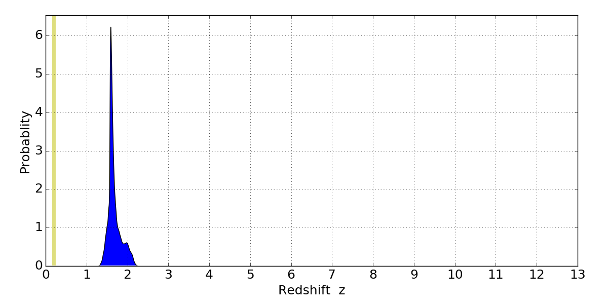 In P(z) plots: Yellow lines mark the cluster redshift z = 0.203,