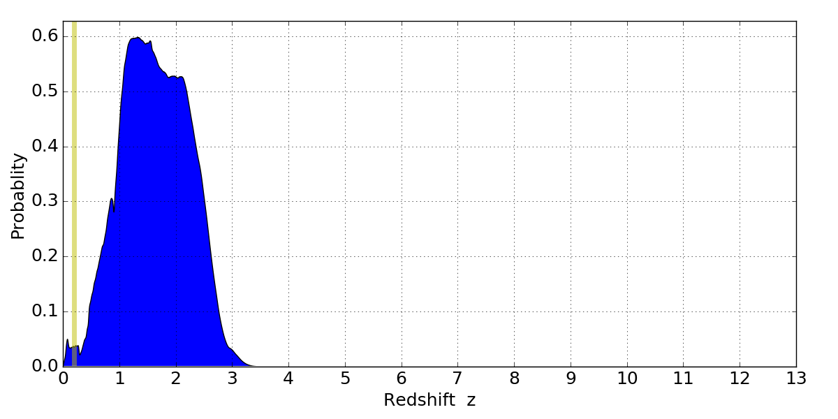 In P(z) plots: Yellow lines mark the cluster redshift z = 0.203,