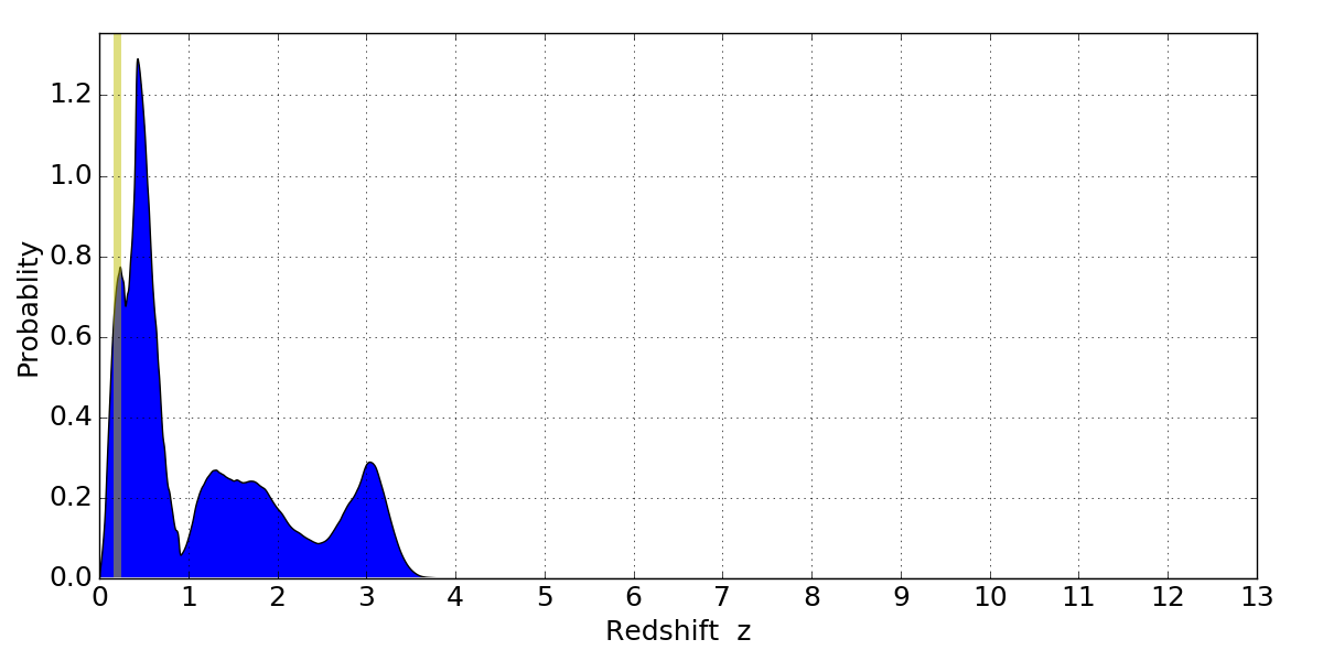In P(z) plots: Yellow lines mark the cluster redshift z = 0.203,