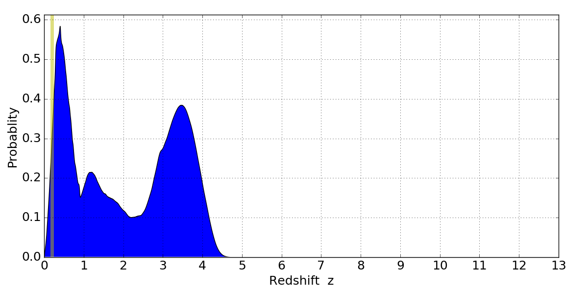 In P(z) plots: Yellow lines mark the cluster redshift z = 0.203,