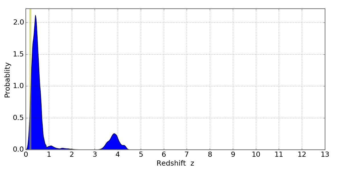 In P(z) plots: Yellow lines mark the cluster redshift z = 0.203,