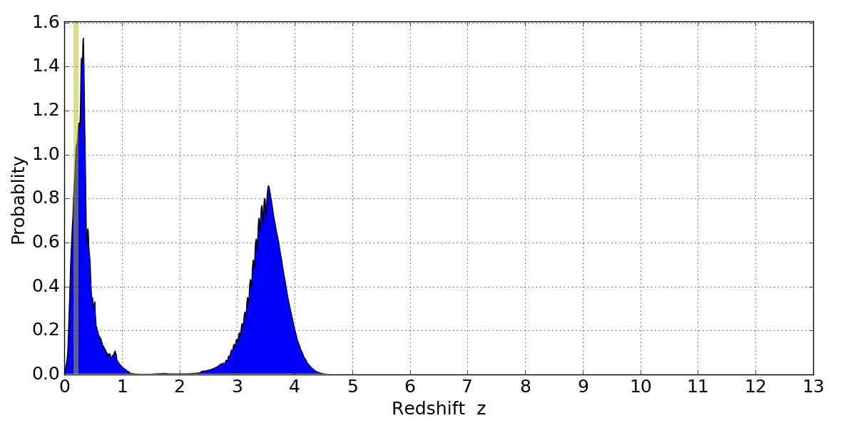 In P(z) plots: Yellow lines mark the cluster redshift z = 0.203,
