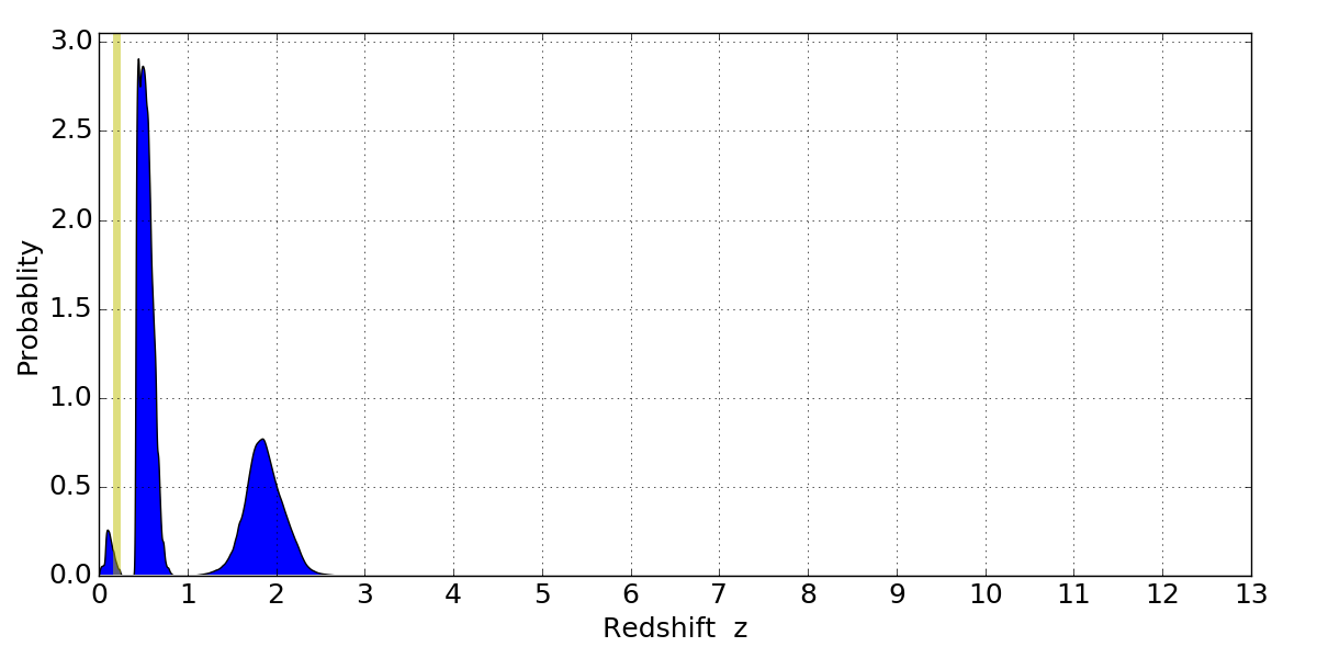 In P(z) plots: Yellow lines mark the cluster redshift z = 0.203,
