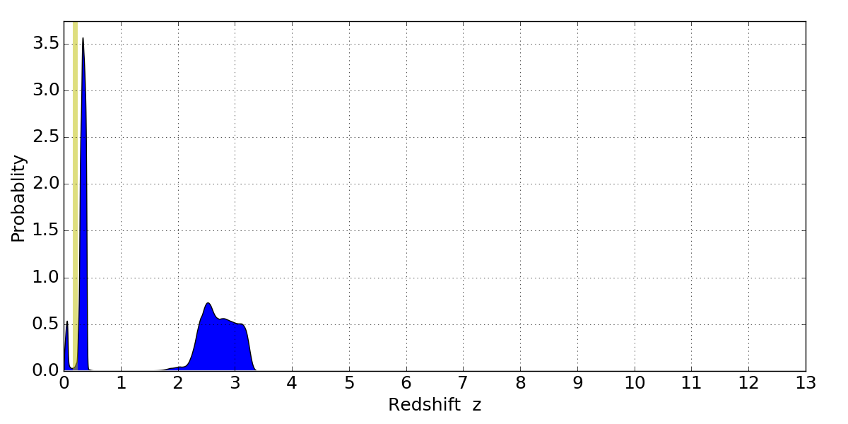 In P(z) plots: Yellow lines mark the cluster redshift z = 0.203,