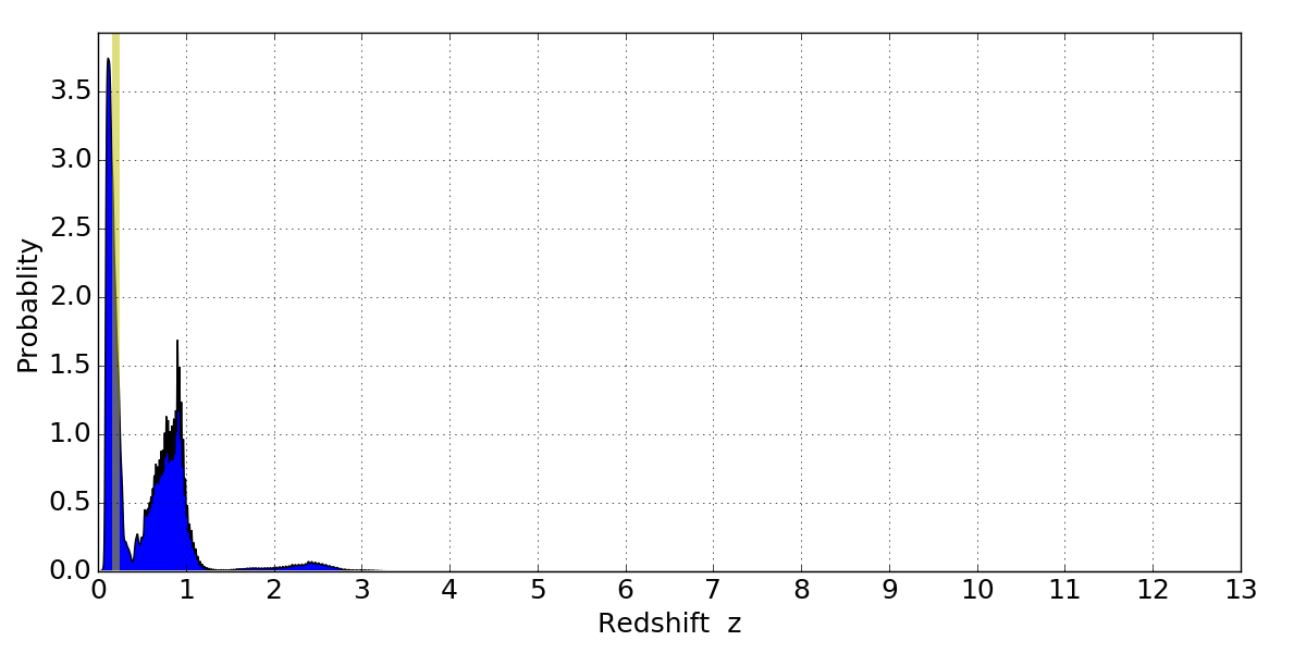 In P(z) plots: Yellow lines mark the cluster redshift z = 0.203,