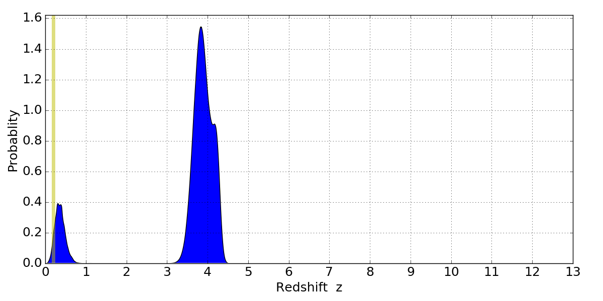 In P(z) plots: Yellow lines mark the cluster redshift z = 0.203,