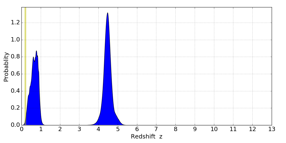 In P(z) plots: Yellow lines mark the cluster redshift z = 0.203,