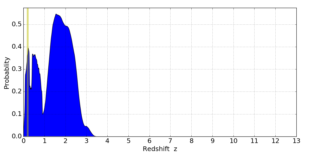 In P(z) plots: Yellow lines mark the cluster redshift z = 0.203,