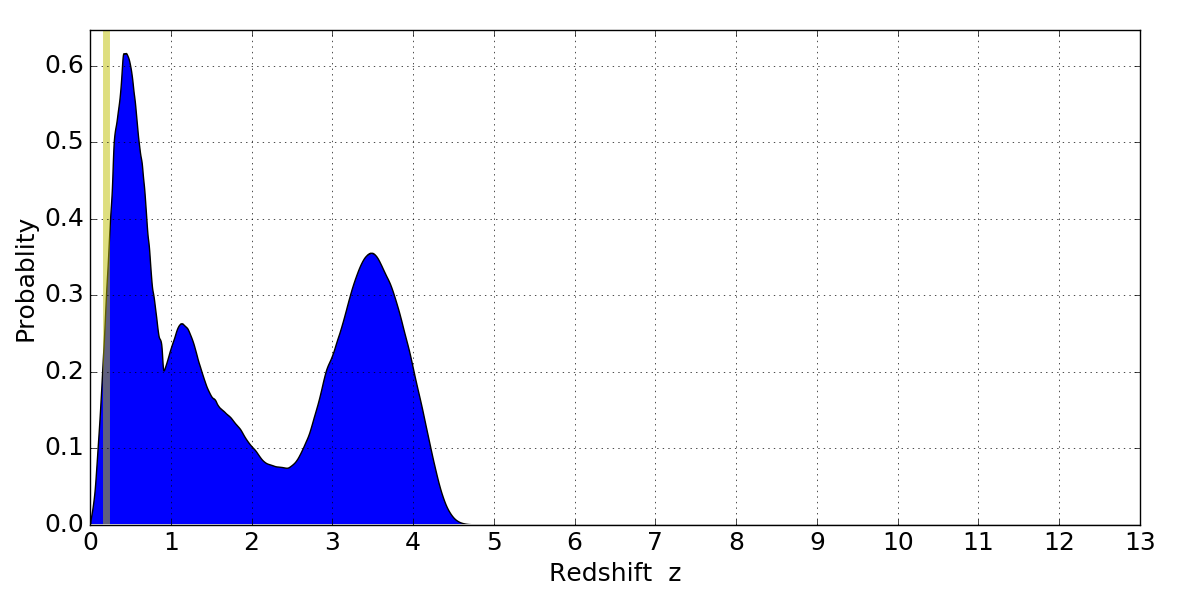 In P(z) plots: Yellow lines mark the cluster redshift z = 0.203,