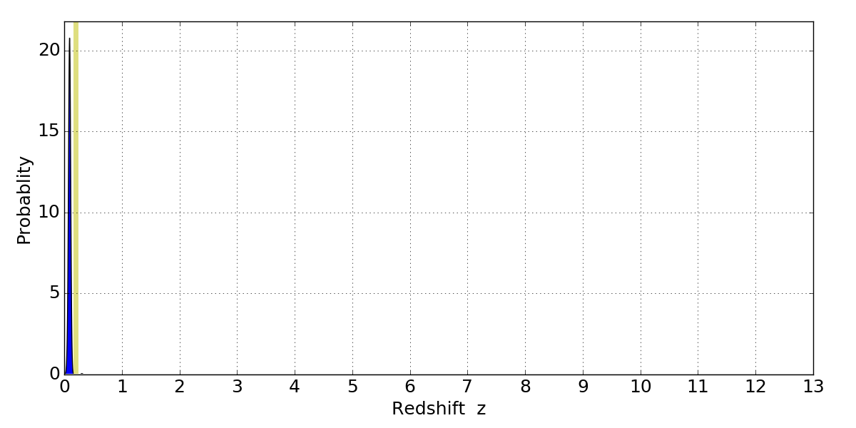 In P(z) plots: Yellow lines mark the cluster redshift z = 0.203,