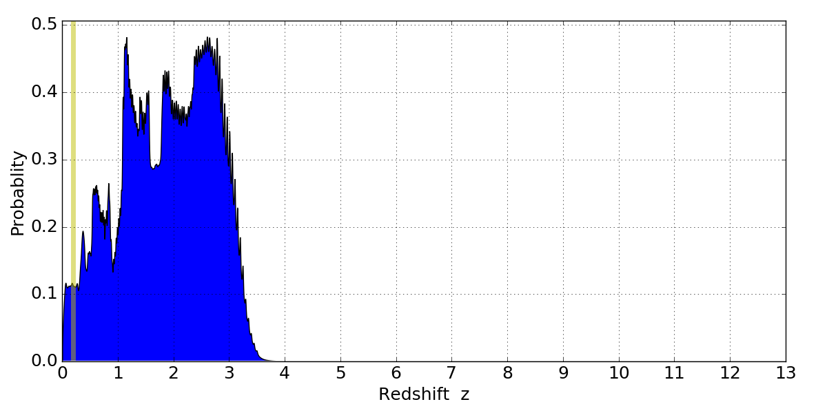 In P(z) plots: Yellow lines mark the cluster redshift z = 0.203,