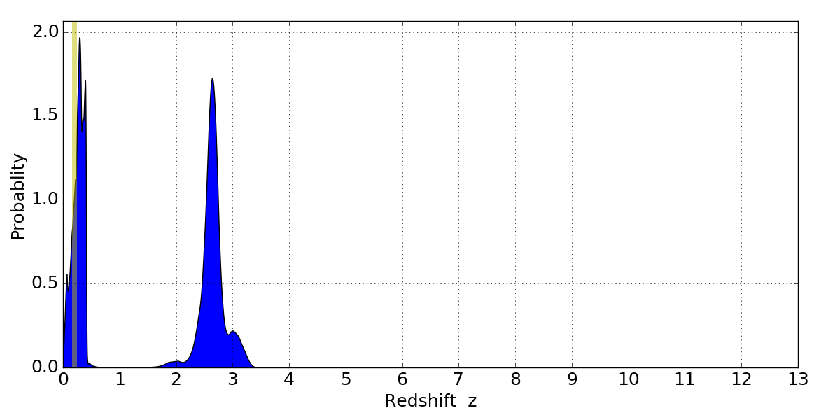 In P(z) plots: Yellow lines mark the cluster redshift z = 0.203,