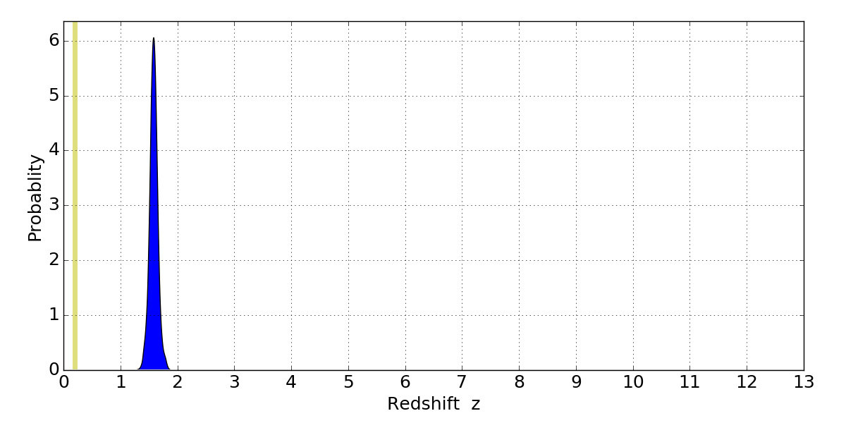 In P(z) plots: Yellow lines mark the cluster redshift z = 0.203,