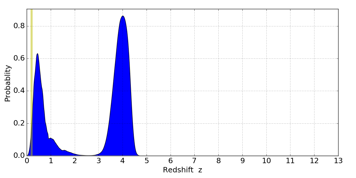 In P(z) plots: Yellow lines mark the cluster redshift z = 0.203,