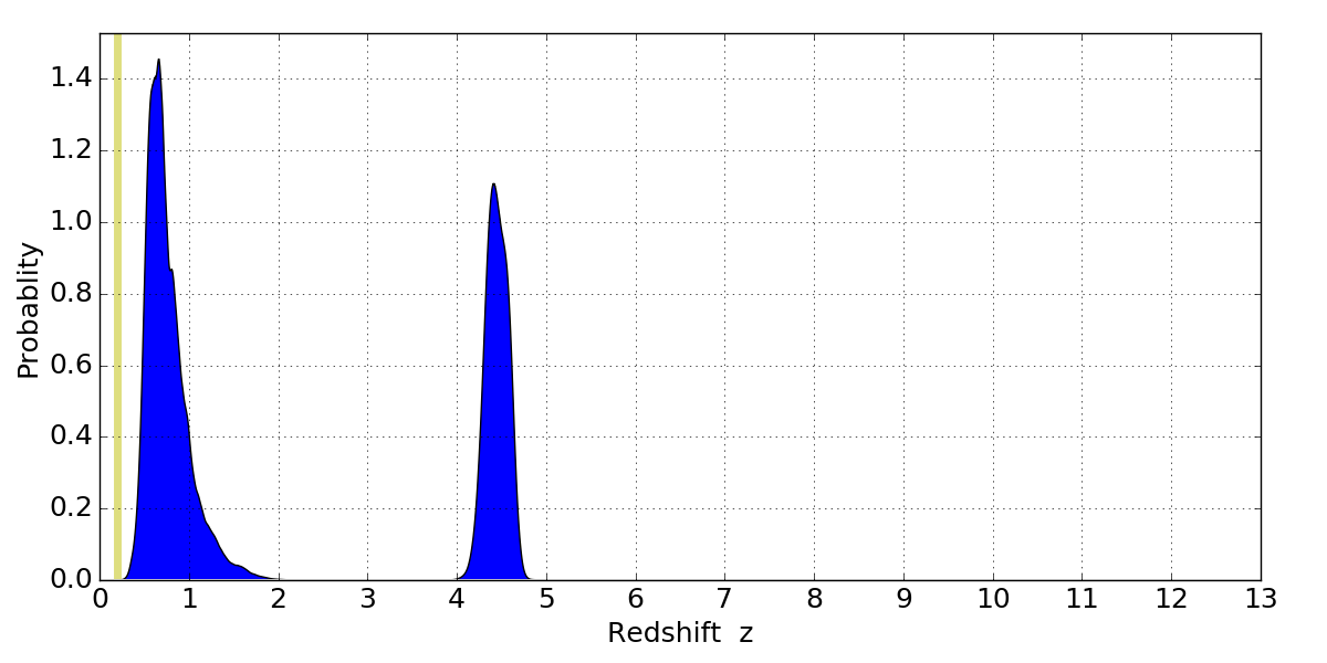 In P(z) plots: Yellow lines mark the cluster redshift z = 0.203,