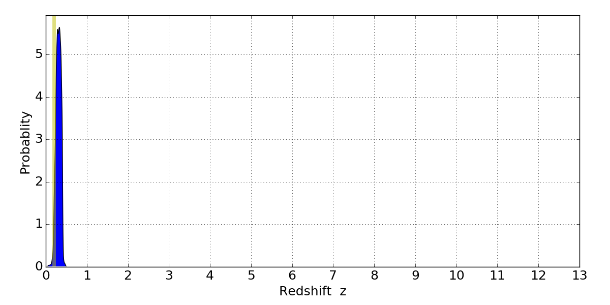 In P(z) plots: Yellow lines mark the cluster redshift z = 0.203,