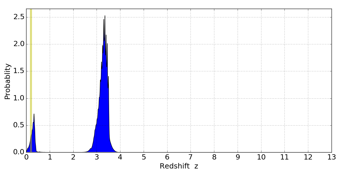 In P(z) plots: Yellow lines mark the cluster redshift z = 0.203,