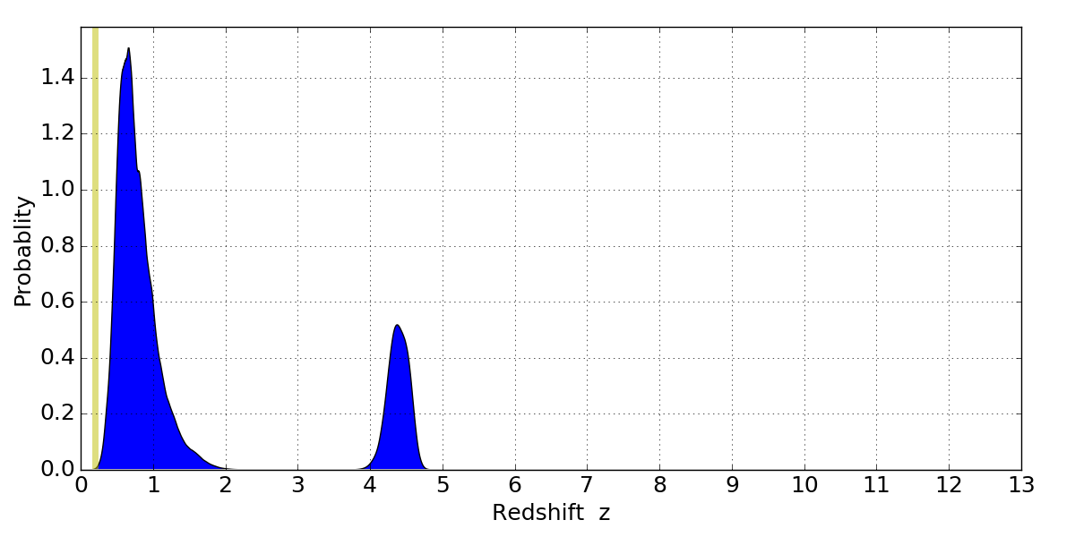 In P(z) plots: Yellow lines mark the cluster redshift z = 0.203,