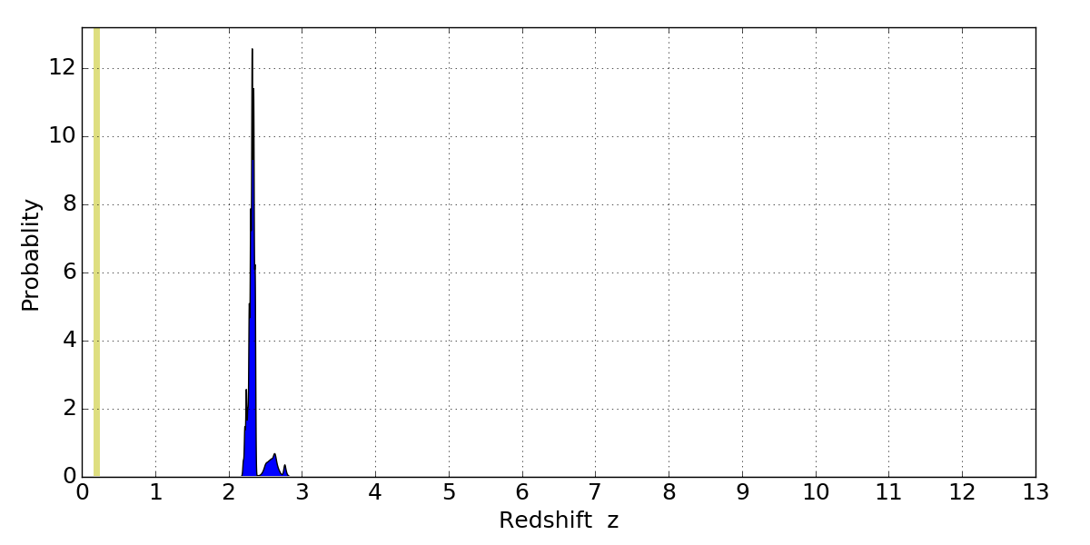 In P(z) plots: Yellow lines mark the cluster redshift z = 0.203,