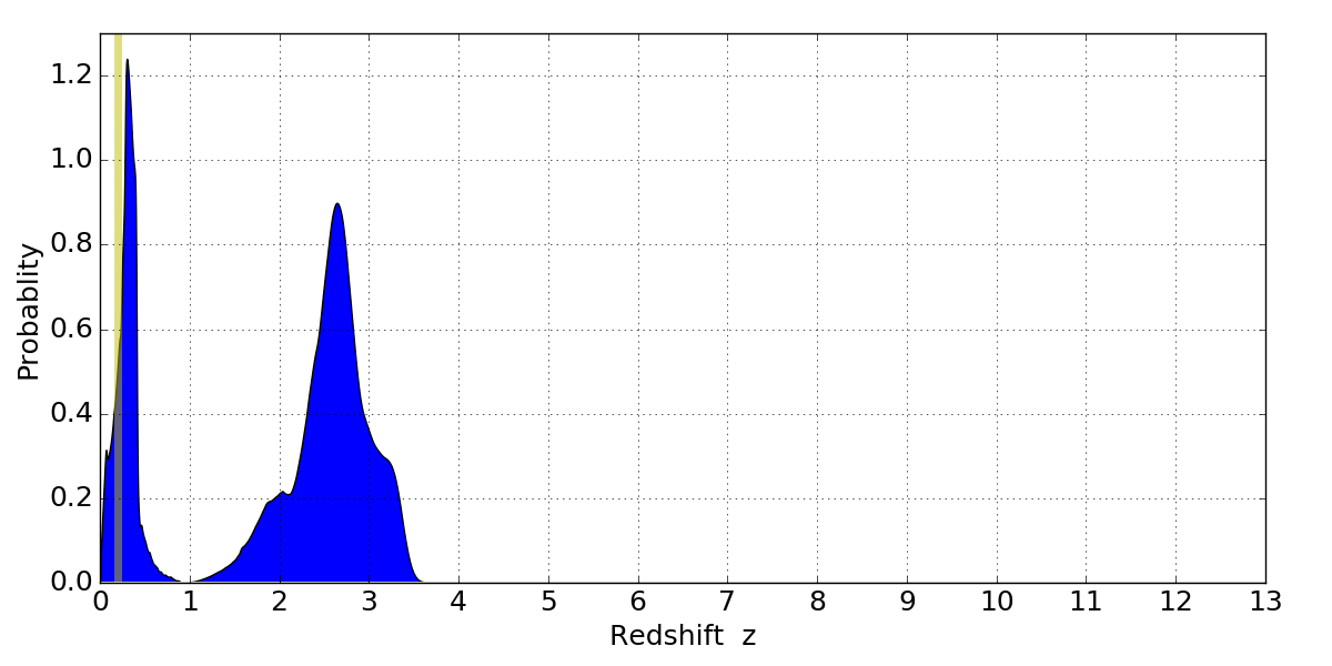 In P(z) plots: Yellow lines mark the cluster redshift z = 0.203,