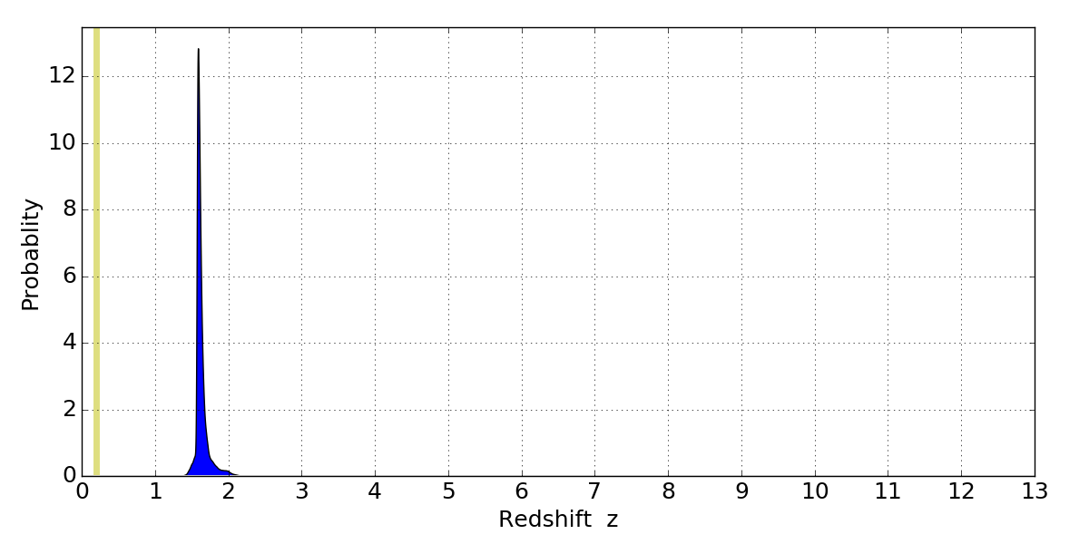 In P(z) plots: Yellow lines mark the cluster redshift z = 0.203,