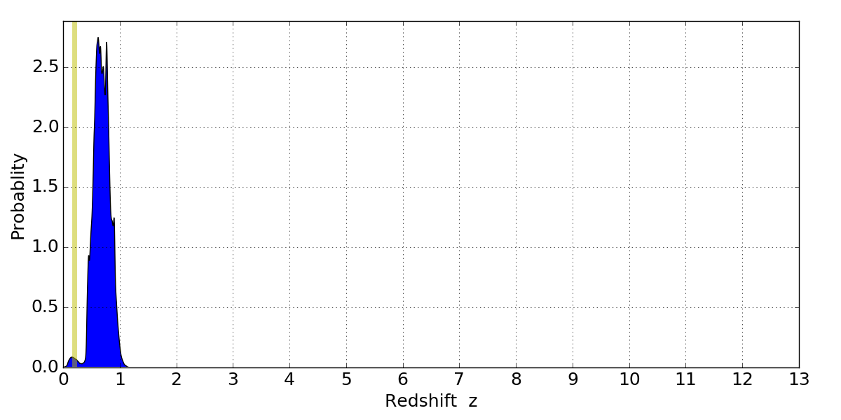 In P(z) plots: Yellow lines mark the cluster redshift z = 0.203,