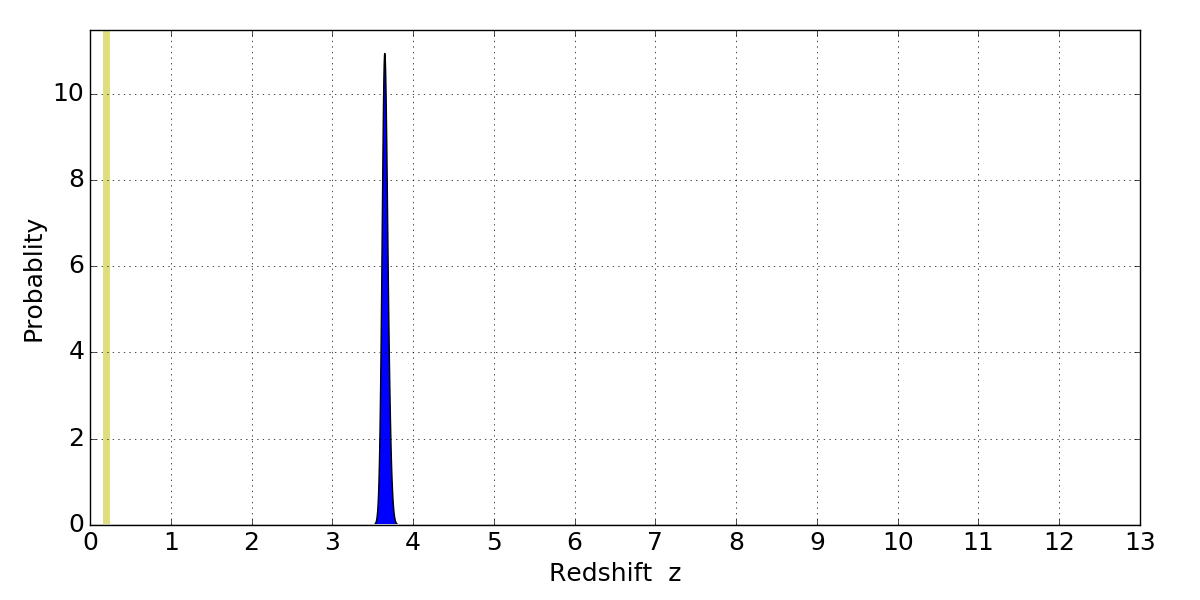 In P(z) plots: Yellow lines mark the cluster redshift z = 0.203,