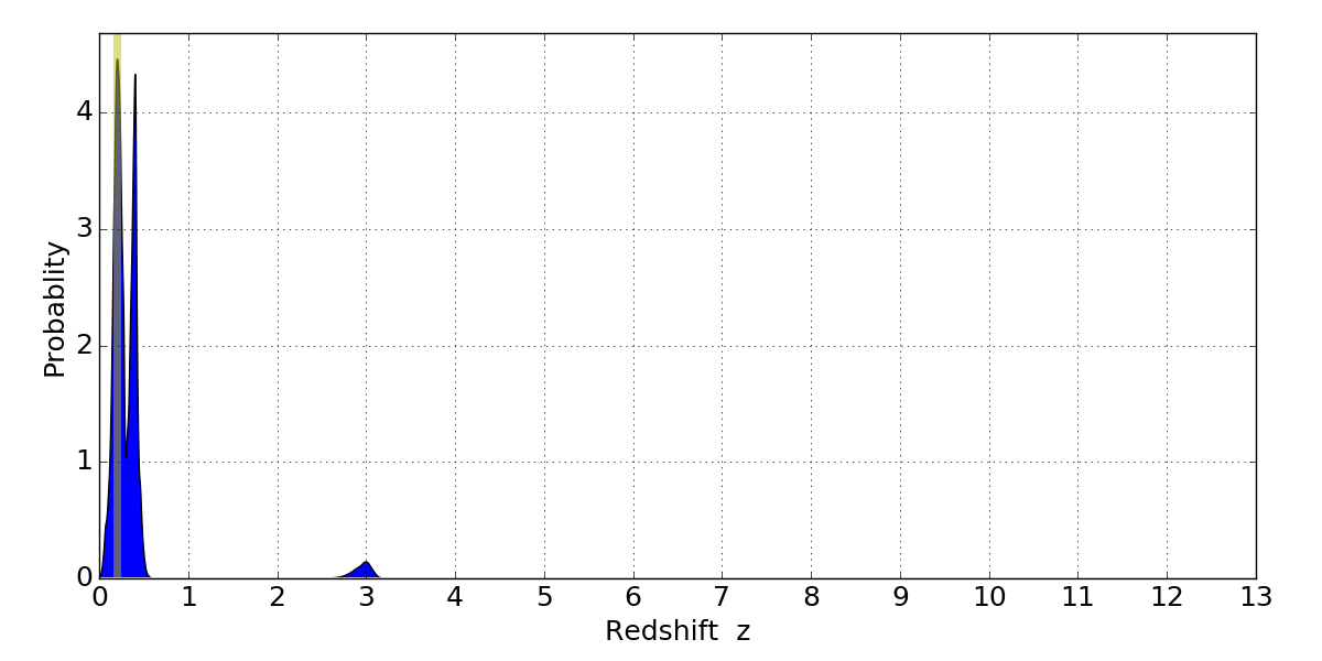 In P(z) plots: Yellow lines mark the cluster redshift z = 0.203,