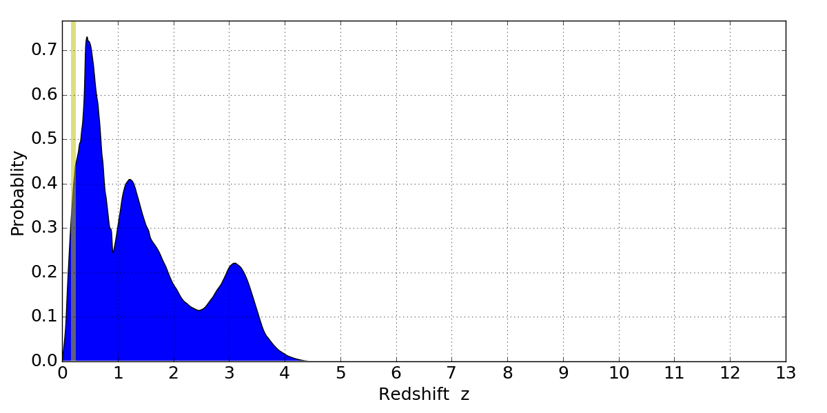 In P(z) plots: Yellow lines mark the cluster redshift z = 0.203,