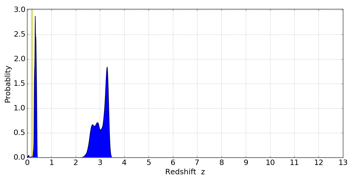 In P(z) plots: Yellow lines mark the cluster redshift z = 0.203,