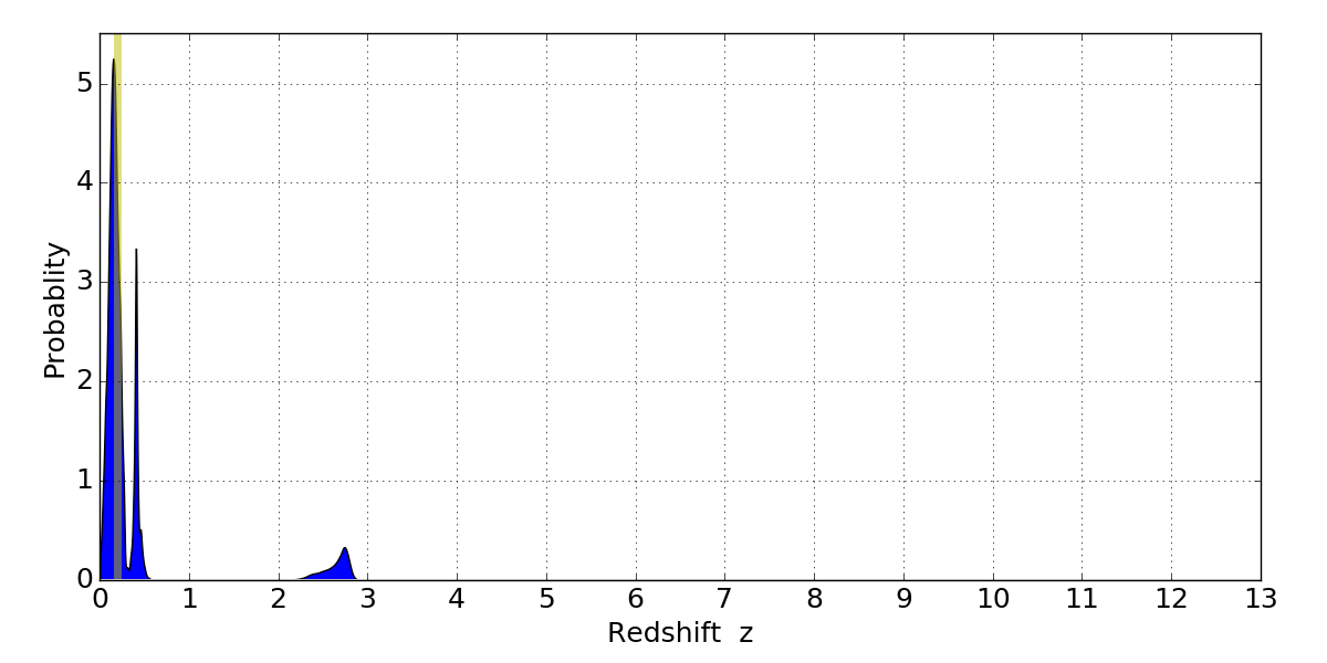 In P(z) plots: Yellow lines mark the cluster redshift z = 0.203,