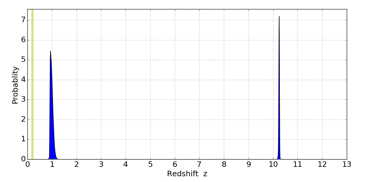 In P(z) plots: Yellow lines mark the cluster redshift z = 0.203,
