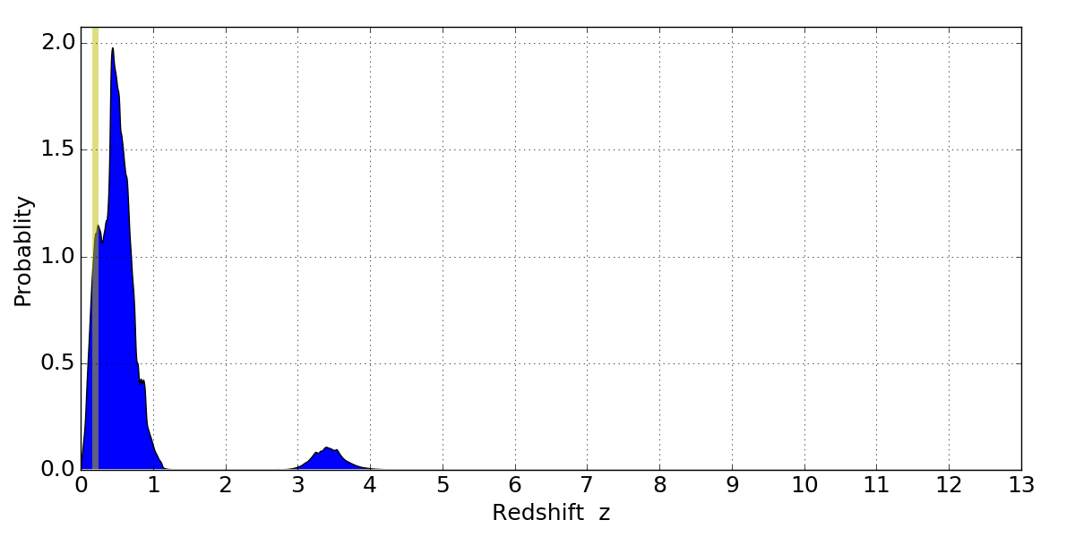 In P(z) plots: Yellow lines mark the cluster redshift z = 0.203,