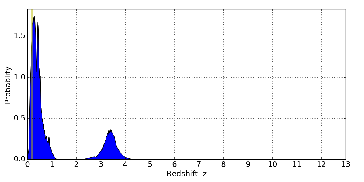 In P(z) plots: Yellow lines mark the cluster redshift z = 0.203,